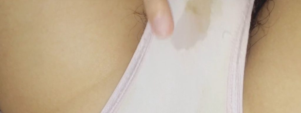 パンティーの上から指で股間を刺激しオナニー。パンティーに卑猥な色のシミをつくる。
